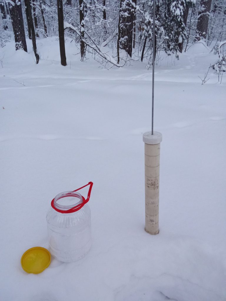 Пробы снежного покрова отбирались специальным поршневым снегоотборником в 5-литровые широкогорлые полиэтиленовые сосуды. В этих сосудах пробы оттаивали, затем определяли объем и прочие характеристики снеговой воды в пересчете на площадь пробоотбора.